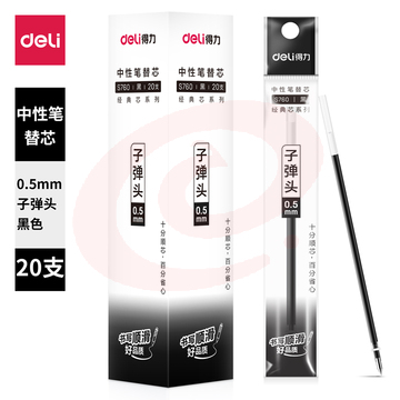 得力S760子弹头中性笔芯0.5mm子弹头(黑)(20支/盒)